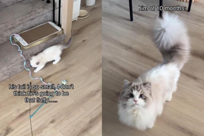 Maurice, a fluffy gray-and-white house cat, stars in a foster-kitten cat clip that melts timelines. The reel shows him “trying…